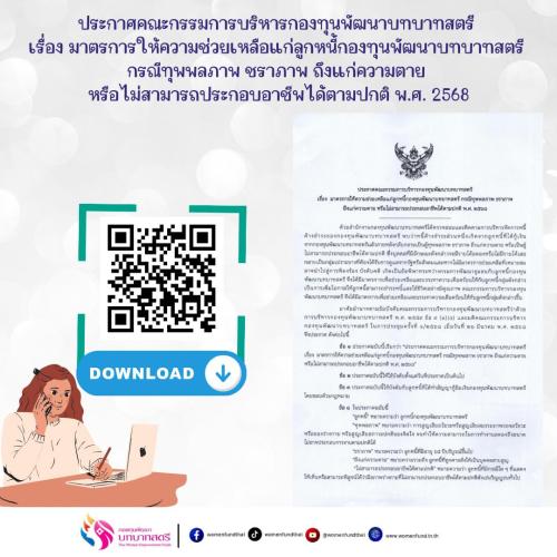 ประกาศคณะกรรมการบริหารกองทุนพัฒนาบทบาทสตรี เรื่อง มาตรการให้ความช่วยเหลือแก่ลูกหนี้กองทุนพัฒนาบทบาทสตรี กรณีทุพพลภาพ ชราภาพ ถึงแก่ความตาย หรือไม่สามารถประกอบอาชีพได้ตามปกติ พ.ศ. 2568